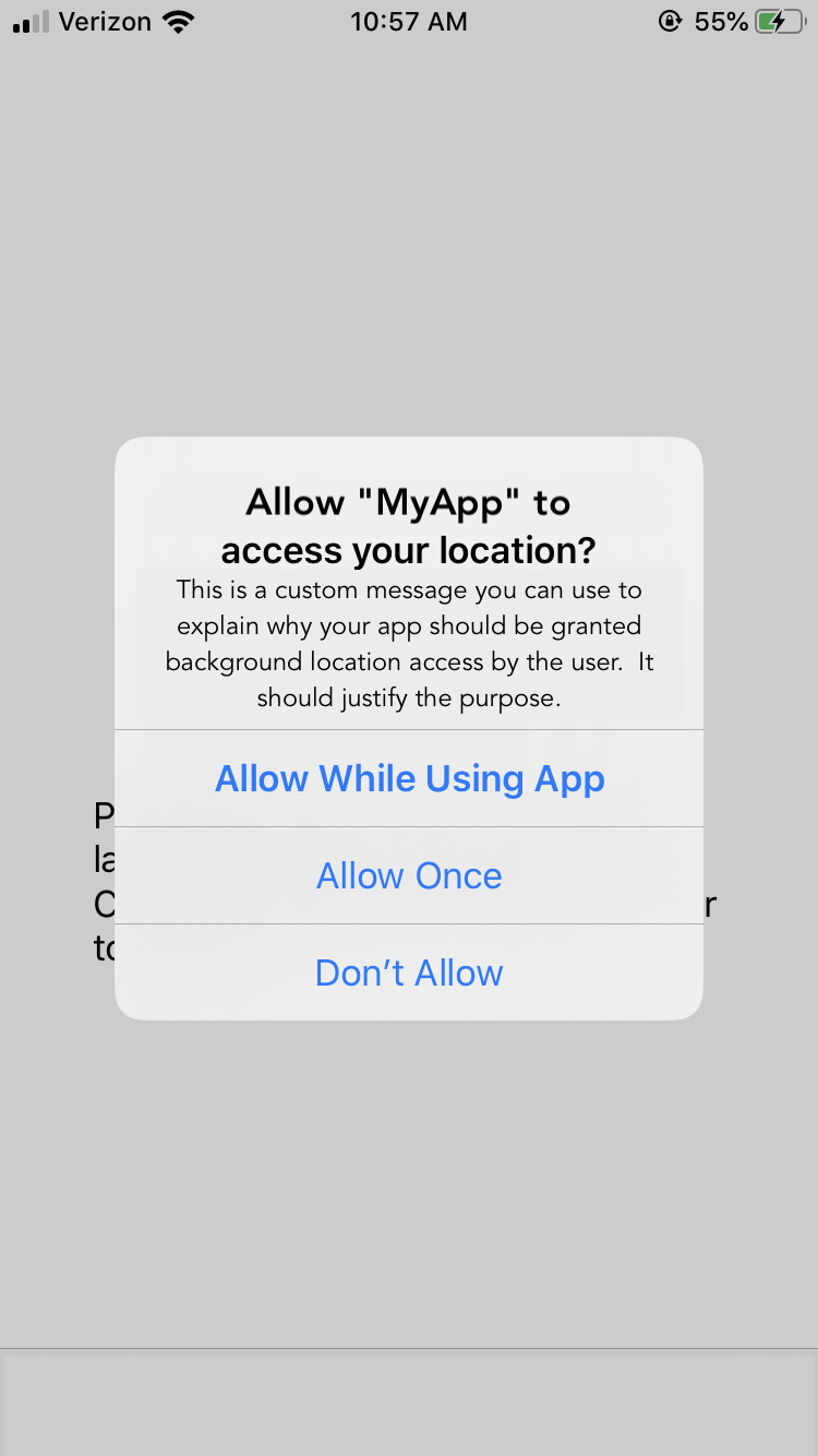 But what about always access for getting location in the background? Note that the new dialog above doesn’t even give that option. This is true even if the code that presented the dialog by specifically requesting always authorization with locationManager.requestAlwaysAuthorization(). The user has to grant one of these two options first, and once one is granted, the app may then request always authorization: